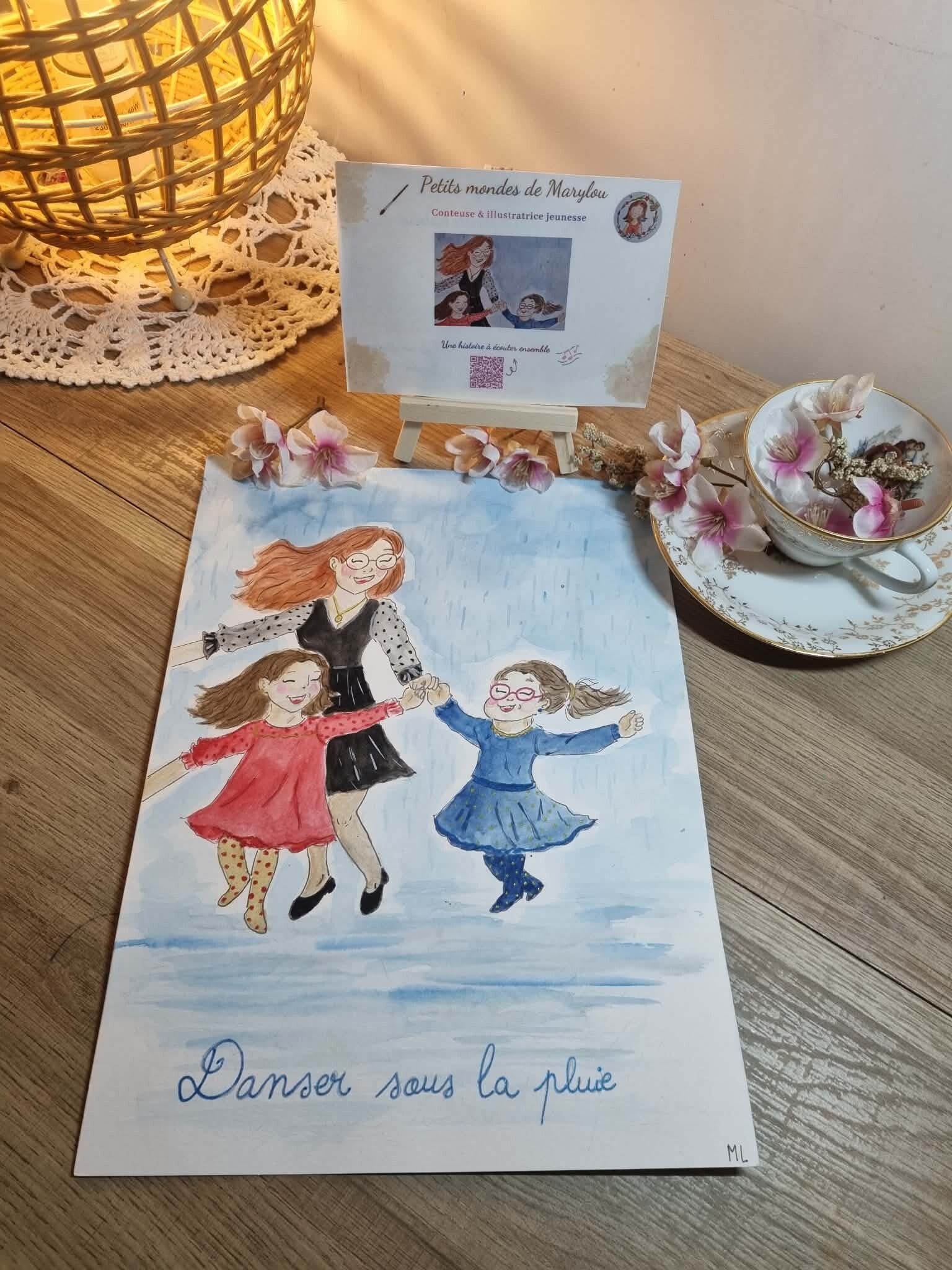 L’aquarelle m’aide à traduire cette douceur et cette sensibilité, tandis que l’option d’une histoire audio personnalisée permet au souvenir de ne pas seulement se regarder… mais aussi de s’écouter et de se revivre.